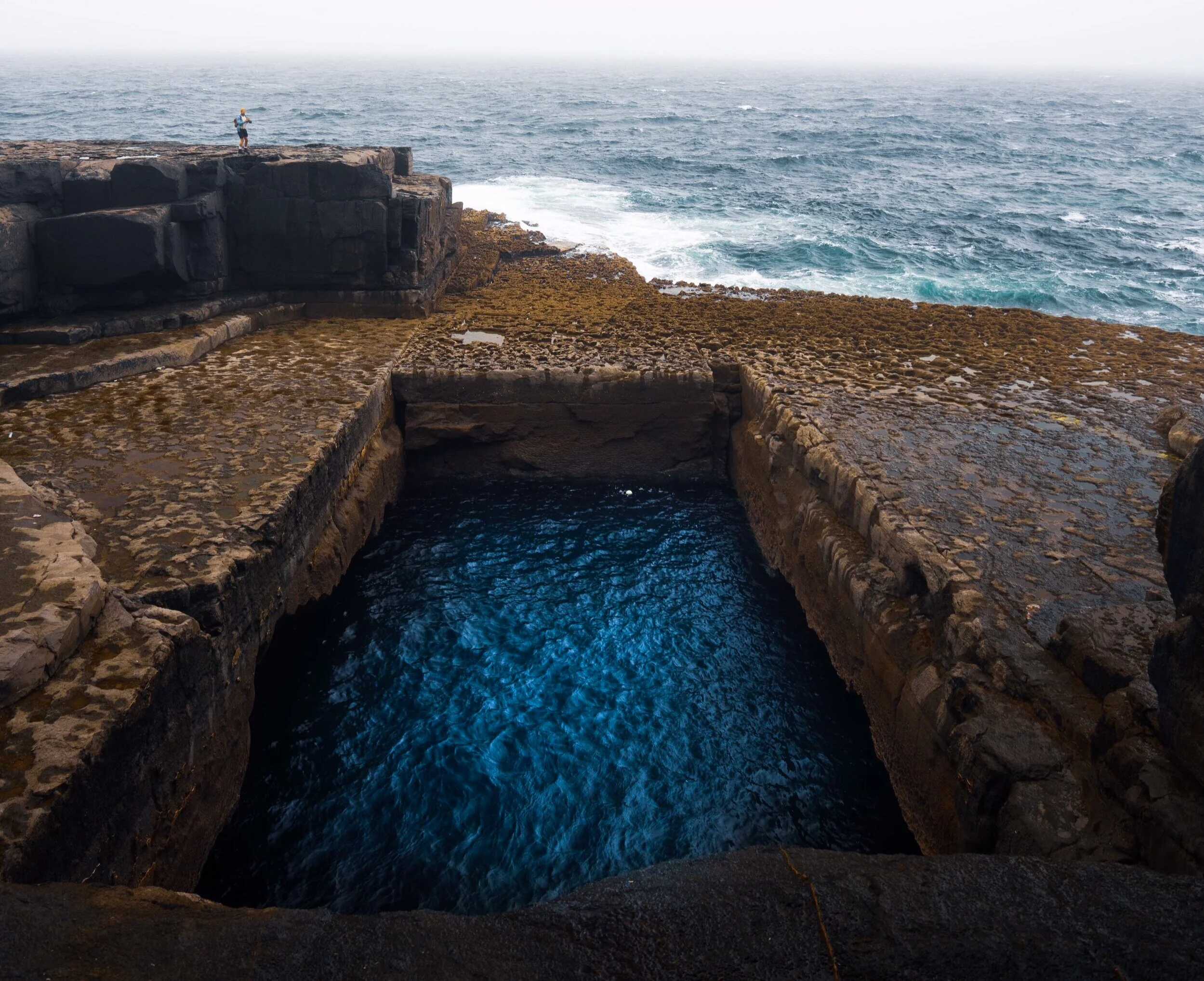 We suggest spending the night in Doolin and grabbing the first ferry over in the morning. If it’s a choppy day expect that seafood platter and four pints of Smithwicks from the night before to come up within 15 minutes. Once you get to the island, apologize to the ferry crew for barfing on deck and head straight to the bike rentals. Hook an immediate left heading past the beach then take the unmarked stone wall road on the right hand side, heading across the the island. There’s a few hills on this cycle so get your arse out of the saddle. After about 30 mins (40 for nerds) you’ll see a tiny wood sign for the wormhole. The road soon ends where you can ditch the bikes and begin the 25 minute walk (25 for nerds ‘cause walking pace is pretty much the same) towards the wormhole. Follow the ominous red arrow paint marks to the promised land and feel the same fear and excitement that every Island rascal must have felt when they first saw Poll na bPeist. Oh and when all is said and done head to Joe Watty’s for a few scoops.
