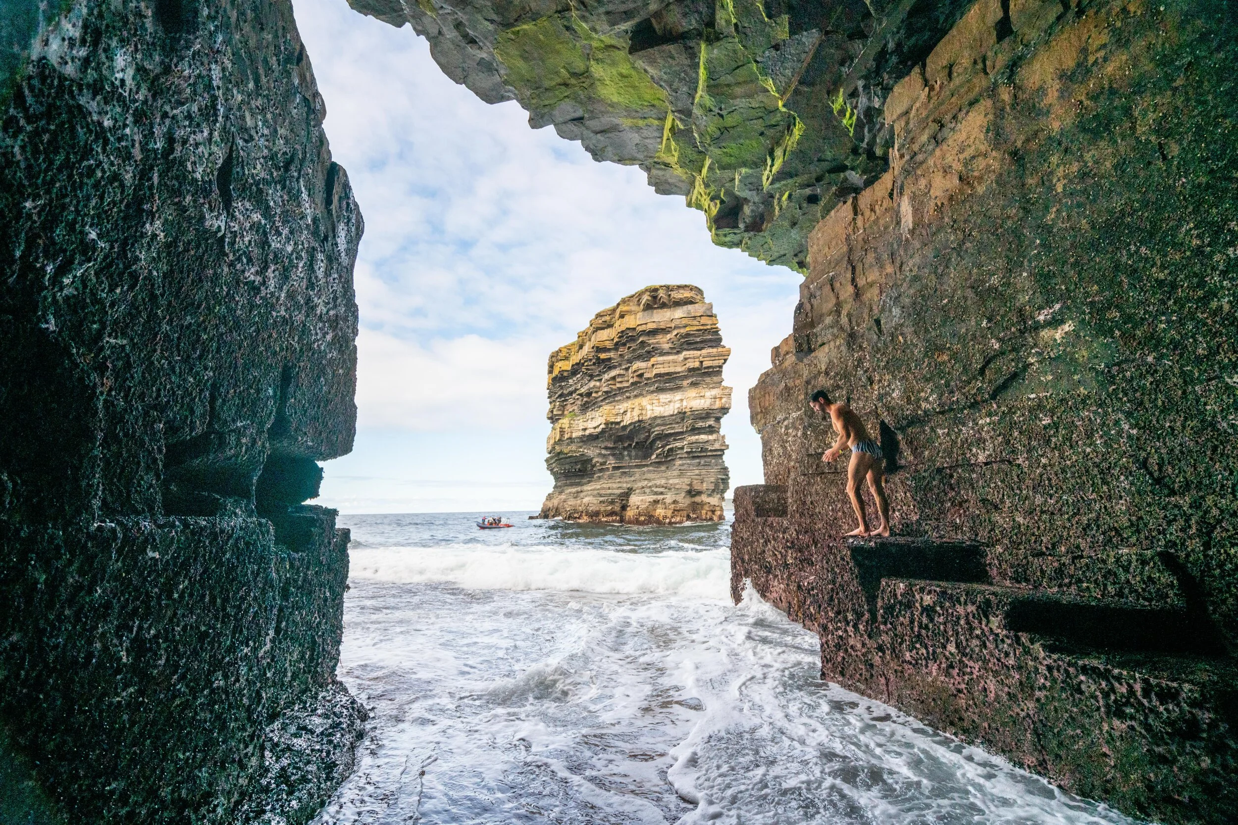 With the action at the cliffs nearing an end we took off to find a path to the bottom of the sea stack. We cruised back to where there was a drop in height (10 meters as opposed to 30) and scaled down to a waterside ledge. Immediately we were soaked by a couple of rogue waves but that just added to the craic. Arriving at the bottom of the sea stack we were greeted by a cavernous gap in the cliff where we whipped off our wet clobber and set out to swim around the sea stack. Not the calmest swim we’ve ever had but maybe the most epic.
